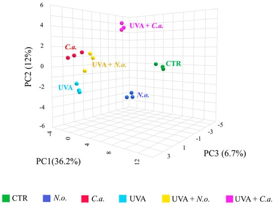 Principal component analysis (PCA) of the skin fibroblasts’ proteome from the experimental cell groups CTR, N.o., C.a., UVA, UVA + N.o., and UVA + C.a. showing an obvious clustering of CTR and UVA samples in distinct groups. (CTR, control cells cultured in the standard growing medium; N.o., cells cultured in the standard growing medium also containing lipid extracts from N. oceanica (2 µg/mL) for 24 h; C.a., cells cultured in the standard growing medium containing lipid extracts from C. amblystomatis (2 µg/mL) for 24 h; UVA, cells exposed to UVA (365 nm) at a dose of 13 J/cm3 and then incubated in the standard growing medium for 24 h; UVA + N.o., cells exposed to UVA (365 nm) at a dose of 13 J/cm3 and then incubated in the standard growing medium containing lipid extracts from N. oceanica (2 µg/mL) for 24 h; UVA + C.a., cells exposed to UVA (365 nm) at a dose of 13 J/cm3 and then incubated in the standard growing medium containing lipid extracts from C. amblystomatis (2 µg/mL) for 24 h; PC1/2/3, principal component 1/2/3.)