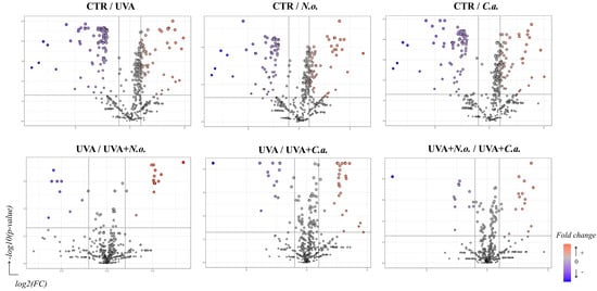 Volcano plots comparing the effects of N. oceanica and C. amblystomatis lipid extracts on the proteome of skin fibroblasts from the experimental cell groups (CTR, control cells cultured in the standard growing medium; N.o., cells cultured in the standard growing medium also containing lipid extracts from N. oceanica (2 µg/mL) for 24 h; C.a., cells cultured in the standard growing medium containing lipid extracts from C. amblystomatis (2 µg/mL) for 24 h; UVA, cells exposed to UVA (365 nm) at a dose of 13 J/cm3 and then incubated in the standard growing medium for 24 h; UVA + N.o., cells exposed to UVA (365 nm) at a dose of 13 J/cm3 and then incubated in the standard growing medium containing lipid extracts from N. oceanica (2 µg/mL) for 24 h; UVA + C.a., cells exposed to UVA (365 nm) at a dose of 13 J/cm3 and then incubated in the standard growing medium containing lipid extracts from C. amblystomatis (2 µg/mL) for 24 h). [Significant features (in blue and red as seen in figure—fold change) had p < 0.05].