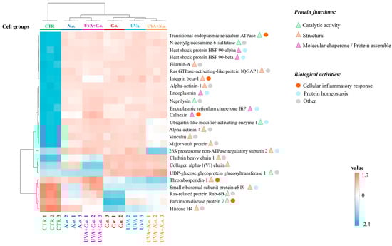 Heatmap, clustering of the top 25 proteins with significantly changed expressions in the skin fibroblasts of the following cell groups: control group (CTR), N. oceanica or C. amblystomatis lipid extract-treated group (N.o./C.a.), UVA-irradiated cell group (UVA), and cell group treated with N. oceanica or C. amblystomatis lipid extracts following UVA irradiation (UVA + N.o./UVA + C.a.), as explained in Table 1. While the protein functions of the mentioned proteins were included, the proteins involved in the regulation of inflammation or protein homeostasis were also indicated.