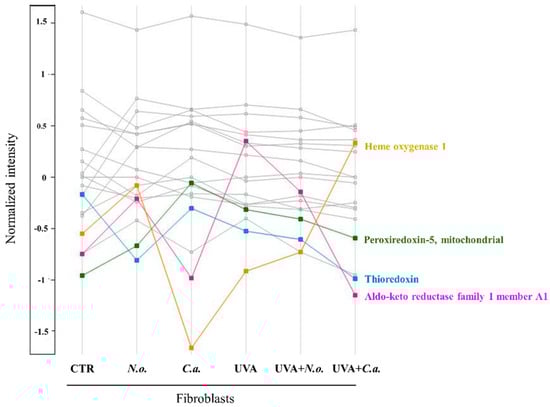Profile plot generated by the Perseus software platform (version 2.0.11.0), using the average intensities (log-transformed and normalized by median) of proteins with cytoprotective activity against oxidative stress whose levels were significantly changed between cell groups (CTR, control cells cultured in the standard growing medium; N.o., cells cultured in the standard growing medium also containing lipid extracts from N. oceanica (2 µg/mL) for 24 h; C.a., cells cultured in the standard growing medium containing lipid extracts from C. amblystomatis (2 µg/mL) for 24 h; UVA, cells exposed to UVA (365 nm) at a dose of 13 J/cm3 and then incubated in the standard growing medium for 24 h; UVA + N.o., cells exposed to UVA (365 nm) at a dose of 13 J/cm3 and then incubated in the standard growing medium containing lipid extracts from N. oceanica (2 µg/mL) for 24 h; UVA + C.a., cells exposed to UVA (365 nm) at a dose of 13 J/cm3 and then incubated in the standard growing medium containing lipid extracts from C. amblystomatis (2 µg/mL) for 24 h). Only the proteins showing at least 3-fold changes (log2FC) were highlighted with pink, blue, green, and yellow colors (different than grey color). Except for thioredoxin, N. oceanica or C. amblystomatis lipid extracts were able to reverse UVA-disrupted expression of aldo-keto reductase family member A1, peroxiredoxin-5, mitochondrial, and heme oxygenase-1 towards their CTR-level expressions. Statistics for the indicated proteins (mean values ± SD of three independent samples and statistically significant differences for p ≤ 0.05) are presented in Supplementary Figure S6.