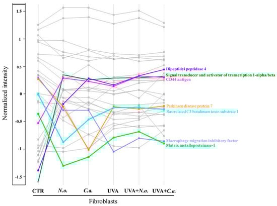 Profile plot generated by the Perseus software platform (version 2.0.11.0), using the average intensities (log-transformed and normalized by median) of proteins participating in the regulation of cellular inflammatory response whose levels were significantly changed between cell groups (CTR, control cells cultured in the standard growing medium; N.o., cells cultured in the standard growing medium also containing lipid extracts from N. oceanica (2 µg/mL) for 24 h; C.a., cells cultured in the standard growing medium containing lipid extracts from C. amblystomatis (2 µg/mL) for 24 h; UVA, cells exposed to UVA (365 nm) at a dose of 13 J/cm3 and then incubated in the standard growing medium for 24 h; UVA + N.o., cells exposed to UVA (365 nm) at a dose of 13 J/cm3 and then incubated in the standard growing medium containing lipid extracts from N. oceanica (2 µg/mL) for 24 h; UVA + C.a., cells exposed to UVA (365 nm) at a dose of 13 J/cm3 and then incubated in the standard growing medium containing lipid extracts from C. amblystomatis (2 µg/mL) for 24 h). Only the proteins showing at least 3-fold changes (log2FC) were highlighted with different colors (different than grey). Statistics for the indicated proteins (mean values ± SD of three independent samples and statistically significant differences for p ≤ 0.05) are presented in Supplementary Figure S7.