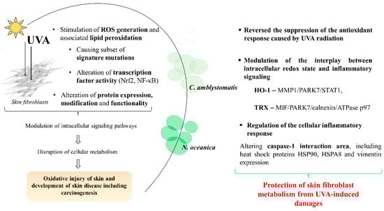 N. oceanica and C. amblystomatis lipid extracts restore the UVA-impaired control expression of antioxidant proteins and proteins involving inflammatory signaling in skin fibroblasts (ultraviolet A, UVA; reactive oxygen species, ROS; nuclear factor erythroid 2-related factor 2, Nrf2; nuclear factor kappa, NF-κB; heme oxygenase-1, HO-1; aldo-keto reductase family member 1 A1, AKR1A1; thioredoxin, Trx; matrix metalloproteinase-1, MMP1; Parkinson’s disease protein 7, PARK7; signal transducer and activator of transcription1-alpha/beta, STAT1; macrophage migration inhibitory factor, MIF).