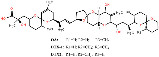 DSP toxins are mainly produced by two marine dinoflagellate genera, Dinophysis and Prorocentrum [23]. Initially, the DSP toxin group included okadaic acid (OA), dinophysistoxins (DTXs), and their derivatives, as well as yessotoxins (YTXs) and pectenotoxin (PTXs) [24]. However, since 2002, YTXs and PTXs have been excluded from the DSP toxin classification, as they have been demonstrated to cause liver necrosis and myocardial damage but not diarrhea [25]. Currently, only OA, DTX-1, DTX-2, and its C-7 acyl derivative (DTX-3), which are found in shellfish [26,27,28], have been confirmed to cause diarrheal effects [29,30]. The LD50 values for the main DSP toxins in mice (intraperitoneally) are 185.6 µg kg−1 for OA, 150.4 µg kg−1 for DTX-1, and 352 µg kg−1 for DTX-2 [31]. These toxins exhibit lipophilic properties, accumulating in adipose tissues and being metabolized and eliminated with difficulty [32]. The principal action mechanism of DSP toxins is the inhibition of serine/threonine protein phosphatases 1 and 2A (PP1 and PP2A), resulting in the deregulation of numerous intracellular processes [33]. Structurally, OA and DTXs share the same carbon backbone, the differences among various analogs are only in the number or position of methyl groups (see Figure 1) [34]. Moreover, as polyether compounds, DSP toxins are fat-soluble and thermally stable [35,36]. Given its lipophilicity, DSP toxins easily accumulate in the tissues of filter-feeding marine organisms that ingest toxic algae, which may result in direct or indirect transmission to humans through the food chain [37]. Thermal stability allows them to remain active even after exposure to cooking temperatures [38]. Since the first DSP incident was reported in 1961, DSP incidents have been continuously occurring worldwide [39].