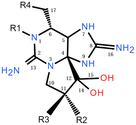 PSP toxins are a group of neurotoxic alkaloids, more than 60 of which have been identified to date and are widely distributed in marine environments [78,79]. These analogs are generally classified into three major groups based on their distinct chemical structures at the R4 site (see Figure 2): carbamate toxins (e.g., GTX1&4, GTX2&3, STX, neoSTX), N-sulfocarbamoyl toxins (e.g., C1&2, C3&4, GTX5, GTX6), and decarbamoyl toxins (e.g., dcGTX1&4, dcGTX2&3, dcSTX, dcneoSTX) [80]. The toxicity of PSP toxins is ranked from highest to lowest as follows: carbamate toxins, decarbamoyl toxins, and N-sulfocarbamoyl toxins [81]. Within these PSP toxins, STX is the most potent neurotoxin, with an LD50 value of 10 µg kg−1 in mice (intraperitoneally) [82]. The minimum lethal dose (MLD) of PSP toxins for humans is reported to be 3000 mouse units (MUs), which is primarily determined based on death cases caused by PSP toxins. A single MU of PSP toxins corresponds to the quantity of toxin capable of killing a 20 g male ddY strain mouse within 15 min following intraperitoneal injection [83]. According to the above data, the PSP toxin-related toxicity characterized by MUs is presented in Table 1. Currently, several marine dinoflagellates, such as Pyrodinium bahamense, Gymnodinium catenatum, and various species of Alexandrium, along with some freshwater cyanobacterial species, have been identified as producers of PSP toxins [84,85,86]. PSP toxins in those marine dinoflagellates exist almost exclusively as β-epimers (GTX3&4, C2&4), while α-epimers (GTX1&2, C1&3) predominate in the shellfish profile, with an epimer α:β ratio close to 3:1 at equilibrium [82]. In addition to common PSP toxin derivatives, many new C-11 hydroxyl metabolites (so-called M-toxins) of PSP toxins have been discovered in contaminated shellfish. Trace amounts of such substances have also been detected in some strains of microalgae that produce PSP toxins [87]. M-toxins are regarded as low-toxic derivatives of typical PSP toxins based on their structure–activity relationships [88]. Considering that M-toxins quickly accumulate in high concentrations within shellfish following the ingestion of PSP toxin-producing microalgae, the M-toxins are regarded as metabolic products of PSP toxins during shellfish detoxification [89]. The toxins M1&M3 and M7&M9 can be transformed from C1&2 and C3&4, respectively, while M2&M4&M6 and M8&M10 can be transformed from GTX2&3 and GTX1&4, respectively. The transformation rates of C&2 and GTX2&3 are significantly higher than those of C3&4 and GTX1&4, and the metabolic transformation of C1&2 to M1&3 occurs most rapidly, which is also faster than the production rate of other M-toxins in scallops and mussels [90]. Furthermore, a new class of PSP toxins, referred to as GC toxins, has been found in G. catenatum, which contain hydroxybenzoate R4 substituents [91]. Unlike the hydrophilic nature of the three main classes of PSP toxins, the hydroxybenzoate side chains in GC toxins introduce a degree of lipophilicity [92]; however, the exact toxicity of GC toxins has not yet been determined.