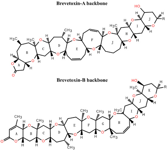 BTXs are based on two different structural backbones, which are perceived to be the two parent molecules, PbTx-1 (brevetoxin-A backbone) and PbTx-2 (brevetoxin-B backbone).