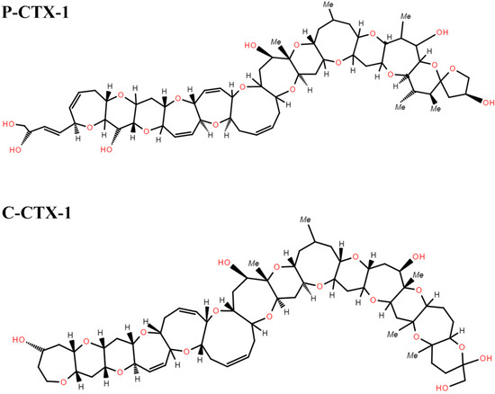 CTXs originate from the benthic dinoflagellate genus Gambierdiscus, which is mainly found in tropical and subtropical seas. When toxin-producing algae are consumed by herbivorous fish, which are consumed by carnivorous fish, CTXs are transferred through the food web, ultimately resulting in poisoning incidents when humans consume fish contaminated with CTXs [244,245,246,247,248]. A survey of CTXs in a coral reef system showed that P-CTX was detected in 54% of herbivorous fish (total P-CTXs < 0.500–1670 pg·g−1 wet weight (ww)), in 72% of omnivorous fish (<0.500–1810 pg·g−1 ww), and in 76% of predatory fish (<0.500–69,500 pg·g−1 ww) [249].