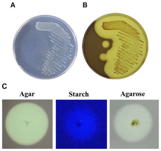For plate-based activity assays of marine bacteria, a sterile toothpick was used for the selection of a single colony; bacteria were punctured in plates on a middle containing 0.3% agar, 0.3% agarose, and soluble starch with 1.5% agar, respectively. The plates were maintained at 30 °C for 48 h. Plates containing agar, agarose, and starch for checking multifunctional enzyme activities were stained with Lugol’s iodine solution, and the clear zone around the hole was visualized.
