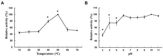 Optimal temperature and pH for crude enzyme activity. (A) Effect of temperature on agarase activity. (B) The optimal pH of agarase’s crude enzyme was measured in 20 mM Na2HPO4/citric acid (pH 3.0, 4.0, and 5.0), 20 mM Na2HPO4/NaH2PO4 (pH 6.0, 7.0, and 8.0), 20 mM Tris/HCl (pH 9.0), and 20 mM Glycin/NaOH (pH 10.0 and 11.0). The mixture was reacted at 30 °C for 30 min to promote enzyme activity by the DNS method. Data are expressed as the mean of triplicate measurements with standard deviation (n = 3, mean ± SD). Data are expressed as mean ± SD. Significance: (A) * p < 0.01, compared with 30 °C. (B) * p < 0.01, compared with pH = 6.