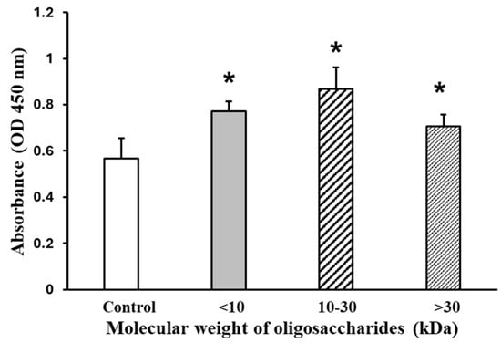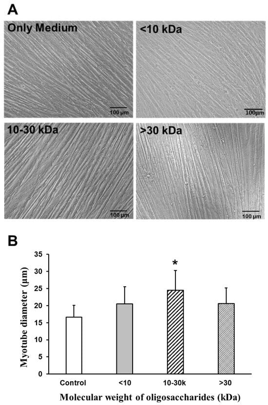 To analyze the effects of AOS on the diameters of C2C12 myotubes, 10 images per group of myotube cultures were taken, using a phase-contrast microscope at 20× magnification. Myotube diameters were measured for a total of 20 myotubes from 10 fields using the BZ-II Analyzer software (BZ-7228 Keyence, Osaka, Japan), selecting the thickest portion of each myotube for measurement. The oligosaccharide mixture was treated at a concentration of 2000 µg/mL, and 2% horse serum (HS)/Dulbecco’s modified Eagle medium (DMEM) was used as the controls. Figure 5A shows microscopic images of the myotubes subjected to each treatment (AOS mixture treatment (2000 µg/mL) <10 kDa; 10–30 kDa; >30 kDa; 2% HS/DMEM medium-only control). The average diameter of the myotubes without any additives (2% HS/DMEM control) was 16.7 μm. When AOS > 30 kDa was added, the diameter was about 20.6 μm. The addition of AOS of 10–30 kDa resulted in a diameter of approximately 24.5 μm, while AOS < 10 kDa resulted in a diameter of about 20.6 μm. Compared to the control, the addition of 10–30 kDa AOS significantly increased the myotube diameter (Figure 5B).