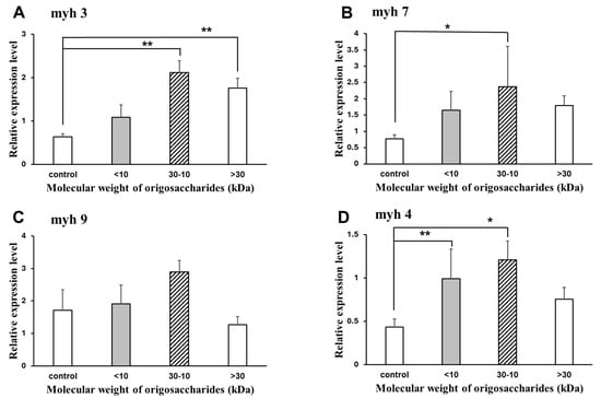 Effect of agaro-oligosaccharide mixture on the expression of myosin heavy-chain genes. Myotubes were incubated with the indicated concentrations of 2000 µg/mL oligosaccharides for 24 h. The ratio between the intensities of the myosin heavy-chain genes and 18S rRNA was calculated. Relative myh3 (A), myh7 (B), myh9 (C), and myh4 (D) mRNA were determined by real-time reverse transcription-polymerase chain reactions. Data are represented as mean ± S.D. (n = 4). Significance: * p < 0.05 and ** p < 0.01, compared with control group (2% HS/DMEM-only culture medium).