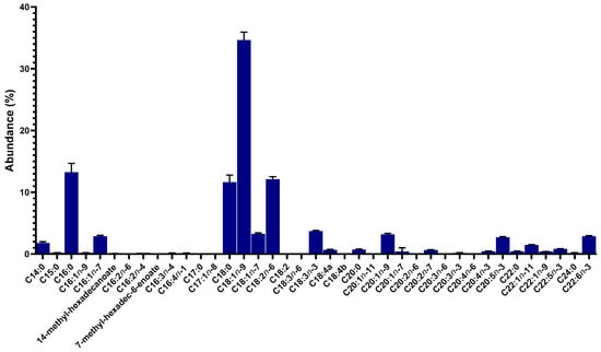 The fatty acid profile of the minced salmon heads was characterized by a very significant content of fatty acids with 18-carbon chains. Oleic acid (C18:1n-9) was clearly the most abundant fatty acid present (34.66 ± 1.26%, Figure 1; 116.0 ± 15.4 μg/mg DW, Supplementary Figure S2) while stearic (C18:0) and linoleic acids (C18:2n-6) were also among the major fatty acids present (11.64 ± 1.14% and 12.10 ± 0.41%, respectively; Figure 1). Palmitic acid (C16:0) was the other fatty acid that was present in more noticeable amounts, representing 13.24 ± 1.44% of all the fatty acid content (Figure 1). Omega-3 fatty acids were present at modest amounts and included linolenic acid (C18:3n-3; 3.70 ± 0.12%, Figure 1; 15.8 ± 2.2 μg/mg DW, Supplementary Figure S2), eicosapentaenoic acid (EPA, C20:5n-3, 2.70 ± 0.12%, Figure 1; 12.6 ± 1.7 μg/mg DW, Supplementary Figure S2), and docosahexaenoic acid (DHA, C22:6n-3, 2.86 ± 0.11%, Figure 1; 12.7 ± 1.4 μg/mg DW, Supplementary Figure S2). In Supplementary Figure S2, the results of the fatty acid profiling are presented in absolute quantities.