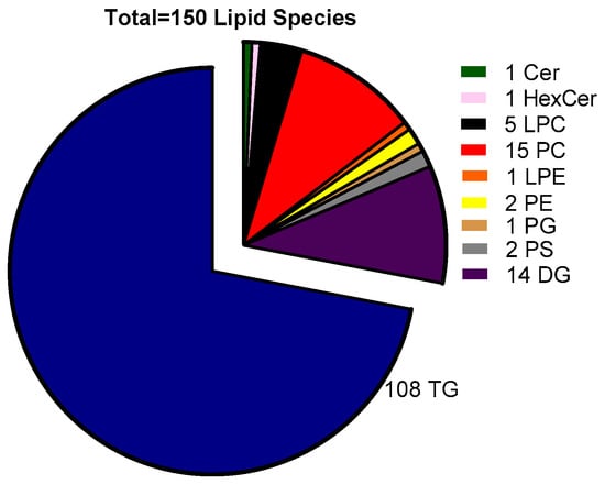 Analysis of the lipidome of the minced salmon heads by LC-MS allowed the identification and semi-quantification of 150 different lipid species (Figure 2). This analysis revealed that triglycerides (TGs) were not only the most abundant but also the most diverse class of lipids present (Figure 2; Supplementary Tables S1 and S2). In fact, 108 different TG species were identified, including one oxidized TG form (TG 50:2;O). Other acylglycerides, namely diglycerides (DGs) were also present, with 14 different species being detected, all in low amounts. In terms of the polar lipid content and phospholipids in particular, the detected species were also present in residual amounts, as was already somewhat inferred from the quantification of phospholipids in lipid total extracts (Table 1). Nevertheless, fifteen PC species and five lysophosphatidylcholines (LPCs) were detected. Other phospholipid classes, namely molecular PEs (2), lysophosphatidylethanolamine (LPE, 1) phosphatidylglycerol (PG, 1) and phosphatidylserine (PS, 2), were barely represented (Figure 2; Supplementary Tables S1 and S2). Two sphingolipids, one ceramide (Cer 42:2;2O), and one hexosylceramide (HexCer 42:2;2O) were also detected.