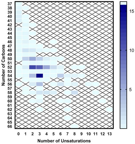 Heatmap depicting the percentages of triglycerides present in minced salmon heads as distributed according to total acyl chain length and unsaturation degree.