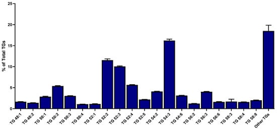 In terms of the specific profiles of TGs, the most prevalent lipid class present in samples of minced salmon heads (Supplementary Figure S3), 108 different molecular species were recorded, with total fatty acyl carbon chains ranging from 37 to 66 total carbons and with the most unsaturated species being TG 62:13 (Figure 3), corresponding to a TG specifically containing one oleic and two DHA esterified fatty acids. Further analysis of the TG profile revealed that TG 54:3 (containing three esterified oleic acids) was the most abundant TG species, representing 16.20 ± 0.35% of the content of the class (Figure 3 and Figure 4). The only other two TG species with contents representing over 10% of the class were TG 52:2 (with the major form containing one palmitic and two oleic esterified fatty acids, representing 11.54 ± 0.32% of total TGs) and TG 52:3 (with the major form containing one palmitic, one oleic, and one linoleic esterified fatty acid, amounting to 10.04 ± 0.15% of the class; Figure 4).