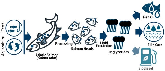 Atlantic salmon (Salmo salar) is a critical resource for human nutrition, normally recognized for its high-quality protein content and for the presence of beneficial fatty acids (FAs), namely omega-3 [1,2,3,4]. As one of the most consumed fish globally, its production is both indispensable and substantial. In 2023, global salmon production reached approximately 3 million metric tons [5], with aquaculture accounting for about 70% of this volume [6]. This high level of production generates significant quantities of co-products including heads, bones, skin, and viscera. Estimates suggest that the fillet yield could represent only 50–70% of the whole salmonid weight [7], implying a production of roughly up to 1.5 million metric tons of salmon co-products annually.