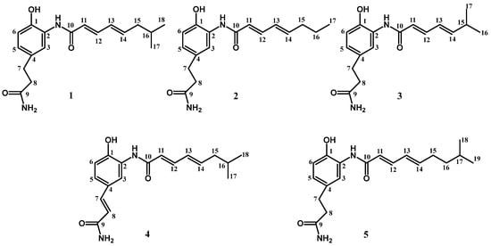 Based on the fact that the upregulation transformant of Streptomyces parvus 1268-Ctd-14 could efficiently increase the yield and diversity of carpatamides, we performed the fermentation of 1268-Ctd-14 and combined its extracts. Then, these extracts were further purified by a combination of CC and HPLC as previously performed and finally obtained other four compounds of 2–5, which have similar UV/Vis spectra with that of compound 1 from Streptomyces parvus 1268-Ctd14 (Figure 1). Their structures were determined on the basis of the ESI-HRMS, as well as 1D and 2D spectral NMR data analysis as previously.