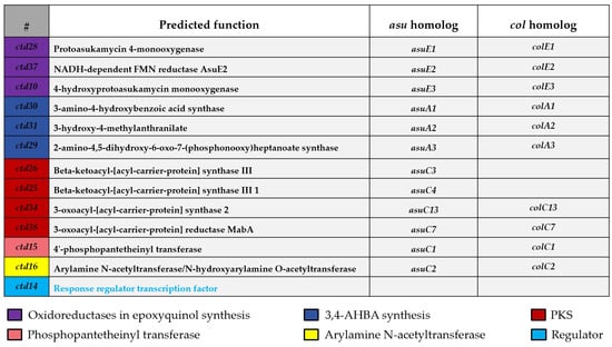 The core ctd genes annotations with asu and col homologs (also part of core genes of manumycin-group metabolites), along with the annotation of regulator gene of ctd14 in ctd.