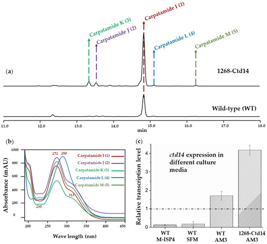 HPLC-DAD analysis results of the fermentation extracts of overexpression transformant of Streptomyces parvus 1268-Ctd14 (1268-Ctd14) and wild-type (WT) at 264 nm in AM3 medium (a). The UV/Vis spectra of compounds 1–5 (carpatamides I–M), while λmax at 272 and 313 nm are the UV/Vis character of compounds 1, 2, 3, 5, which is similar to that of carpatamides A and B (b). Gene expression analysis of ctd14 in different culture media for WT and 1268-Ctd14 (c).