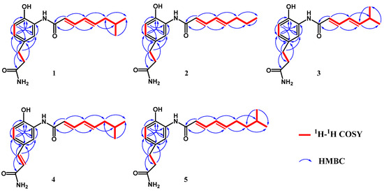 Key COSY and HMBC correlations of carpatamides I–M (1–5).