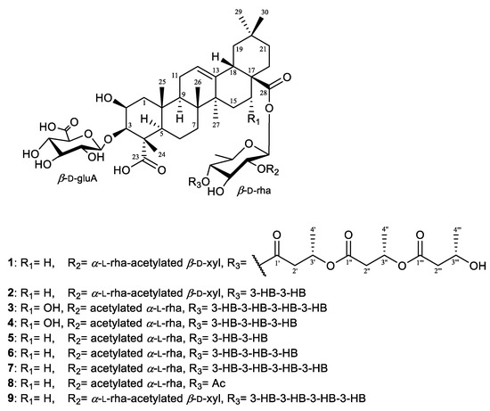 The need for new antiviral agents is highlighted by the increasing incidence of viral diseases and the shortcomings of existing antiviral therapies [13]. Drug discovery has always relied heavily on natural products because of their structural diversity [14]. In addition to their well-known anti-inflammatory, antioxidant, and anticancer effects, saponins have shown encouraging antiviral activity. For example, ginsenoside Rd interferes with the life cycle of coxsackievirus B3 (CVB3), whereas ginsenoside Rb1 inhibits enterovirus 71 (EV71) by blocking viral replication [15]. Similarly, glycyrrhizin, a saponin from licorice root (Glycyrrhiza glabra), suppresses hepatitis C virus and influenza A virus (IAV) [16,17,18]. In another study, a fraction rich in the acylated triterpene saponins, QS-17, QS-18, and QS-21 from Quillaja saponaria, showed the prevention of rotavirus causing severe diarrhea [19]. On the basis of these studies, we aimed to investigate the structure and potential antiviral properties of four previously unreported saponins with unusual poly 3-HB chains, pannosides F–I (1–4), isolated from A. tripolium, in addition to pannosides A–E (5–9). In this study, we evaluated the antiviral activities of all pannosides (1–9) against enterovirus A71 (EV71), coxsackievirus B3 (CVB3), and rhinovirus 1B (HRV1B).