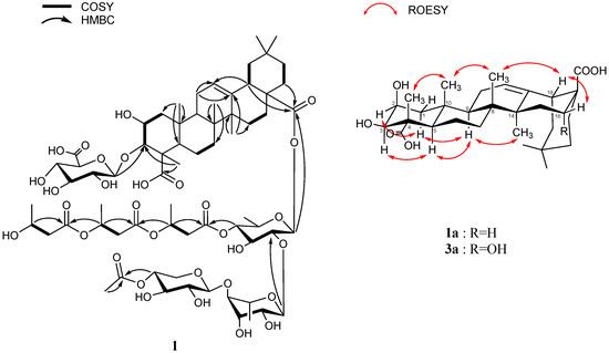 Key COSY, HMBC correlation of 1, and ROESY correlation of an aglycone.