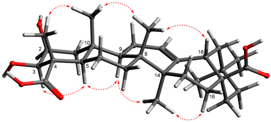 The signals of the aglycone moiety indicate the presence of six tertiary methyls, nine methylenes, three oxygenated methines, two methines, one olefinic, and nine quaternary carbons. In particular, proton signals at δH 4.27 (CH-2), 4.08 (CH-3), and 4.42 (CH-16) and carbon signals at δc 71.3 (C-2), 86.6 (C-3), and 75.1 (C-16) indicate three oxygenated methines. The proton-proton coupling was confirmed by the COSY spectrum, and the proton-carbon correlation confirmed by the HMBC spectrum was similar to that of pannoside F. The relative configuration was determined from the ROESY spectrum. Through-space couplings of H-3/H-5/H-9 and H-9/H3-27specified that H-3, H-5, H-9, and H3-27 were located in the same directions. Additionally, H3-24/H3-25/H3-26/H-18 and H-18/H-16 revealed that H-16, H-18, H3-24, H3-25, and H3-26 were in the same orientation. As a result, the chemical structure of the aglycone in 3 (3a) was proposed as a pentacyclic triterpenoid glycoside, 2β,3β,16α-trihydroxyolean-12-ene-23,28-dioic acid, named zanhic acid [20,21]. In addition, the aglycone was confirmed through LC-QTOF-MS and NMR by removing the sugar moiety through acid hydrolysis (Figures S35–S38).