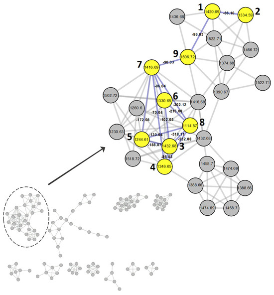 GNPS molecular networking cluster designated as pannoside analogs from the extract of Aster tripolium. The numbers beside nodes denote compounds 1–9. 1, pannoside F (m/z 1420.69 [M + NH4]+); 2, pannoside G (m/z 1334.59 [M + NH4]+); 3, pannoside H (m/z 1432.68 [M + NH4]+); 4, pannoside I (m/z 1346.65 [M + NH4]+); 5, pannoside A (m/z 1244.61 [M + NH4]+); 6, pannoside B (m/z 1330.65 [M + NH4]+); 7, pannoside C (m/z 1416.69 [M + NH4]+); 8, pannoside D (m/z 1114.57 [M + NH4]+); 9, pannoside E (m/z 1506.72 [M + NH4]+). MS differences are indicated on the lines between nodes.