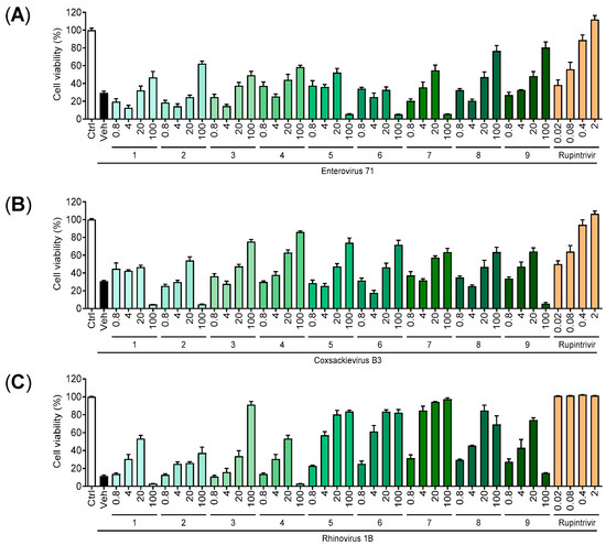 Antiviral activities of pannosides (1–9) compared to rupintrivir (positive control). Pannosides and rupintrivir were treated to virus added mammalian cells 0.8 to 100 µM and 0.02 to 2 µM, respectively. Antiviral activity against (A) enterovirus A71 (EV71) in Vero cells; (B) coxsckievirus B3 (CVB3) in Vero cells; (C) rhinovirus 1B (HRV1B) in HeLa cells.