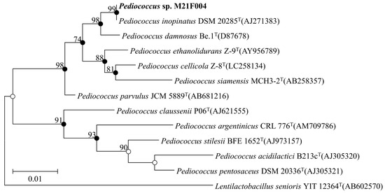 Comparative 16S rRNA gene sequence analysis showed that strain M21F004 was closely related to Pediococcus inopinatus DSM 20285T, sharing 100% similarity. Phylogenetic analysis based on 16S rRNA gene sequences using the maximum-likelihood (ML), maximum-parsimony (MP), and neighbor-joining (NJ) algorithms further confirmed that strain M21F004 formed a monophyletic clade with other species in the genus Pediococcus (Figure 1). Consequently, based on the nearly complete 16S rRNA gene sequence comparison, the strain was clearly affiliated with the isolated genus Pediococcus and was consequently named Pediococcus sp.