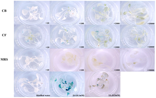 Two 12-day-old A. thaliana plants were transplanted into each well of a 24-well plate, with each well containing 2.5 mL of liquid medium mixed with the CB and CFS of Pediococcus sp. M21F004 at final dilutions of 10-fold, 100-fold, 1000-fold, and 10,000-fold. In this study, the CB refers to the whole culture containing both bacterial cells and extracellular metabolites. The CFS refers to the filtered culture broth, which excludes bacterial cells but retains extracellular metabolites. The plants were subsequently incubated at room temperature on an orbital shaker for 2 days. Salicylic acid served as a positive control, whereas MRS medium served as a negative control. Histochemical GUS staining was performed as described previously [47]. GUS activity was qualitatively assessed by observing the development of a blue color under an optical microscope (Stemi 508; Carl Zeiss, Jena, Germany).