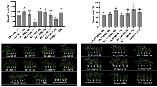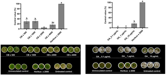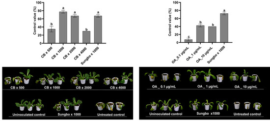 In parallel, OA demonstrated control values of 42.6 and 40% against kimchi cabbage soft rot when treated at concentrations of 1 and 10 µg/mL, respectively.