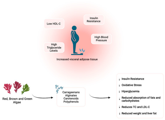 In recent decades, various natural compounds have been shown to exert multiple beneficial effects, including anti-inflammatory, antihyperglycemic and antilipemic activities, which contribute to improving lipid and blood glucose levels as well as increasing insulin sensitivity. Among these natural compounds, seaweed has received increasing attention due to its rich micro- and macronutrient profile. These products have been and continue to be used in nutraceuticals and functional foods for the management of comorbidities associated with MetS [72].