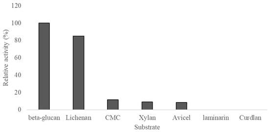 - Huang, Z.; Ni, G.R.; Wang, F.; Zhao, X.Y.; Chen, Y.D.; Zhang, L.X.; Qu, M.R. Characterization of a Thermostable Lichenase from Bacillus subtilis B110 and Its Effects on ?-Glucan Hydrolysis. J. Microbiol. Biotechnol. 2022, 32, 484–492. [Google Scholar] [CrossRef] [PubMed]
