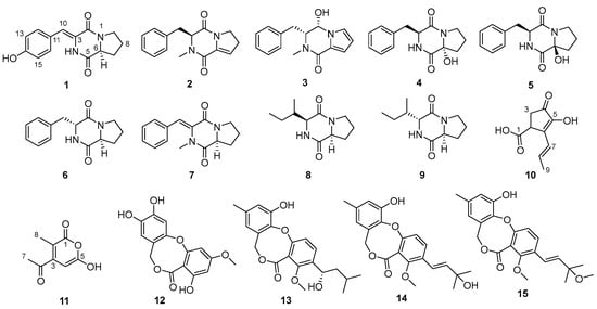 APA StyleZeng, Z., Cai, J., Chen, Y., Li, X., Chen, C., Liu, Y., Jayasinghe, L., & Zhou, X. (2024). Three New Dipeptide and Two New Polyketide Derivatives from the Mangrove-Derived Fungus Talaromyces sp.: Antioxidant Activity of Two Isolated Substances. Marine Drugs, 22(12), 559. https://doi.org/10.3390/md22120559