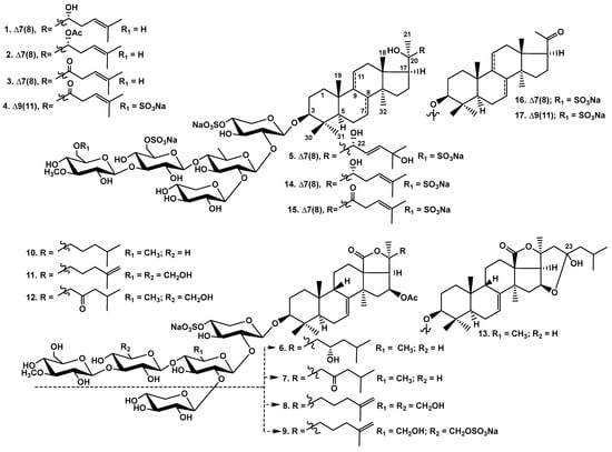 Chemical structures of glycosides of Cucumaria conicospermium. New glycosides: 1—conicospermiumoside A3-1; 2—conicospermiumoside A3-2; 3—conicospermiumoside A3-3; 4—conicospermiumoside A7-1; 5—conicospermiumoside A7-2. Known compounds: 6—djakonovioside A; 7—okhotoside A1-1; 8—okhotoside B1; 9—okhotoside B2; 10—frondoside A; 11—okhotoside A2-1; 12—cucumarioside A2-5; 13—djakonovioside B2; 14—frondoside A7-4; 15—djakonovioside F1; 16—koreoside A; 17—isokoreoside A.