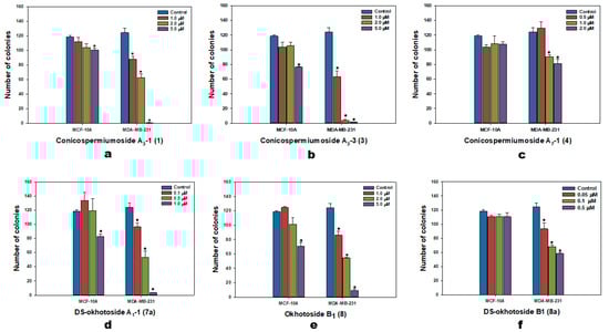 The number of MCF-10A and MDA-MB-231 cell colonies under treatment with different concentrations of the glycosides: (a)—conicospermiumoside A3-1 (1) at concentrations 1, 2, and 5 μM, (b)—conicospermiumoside A3-3 (3) at concentrations 1, 2, and 5 μM, (c)—conicospermiumoside A7-1 (4) at concentrations 0.5, 1, and 2 μM, (d)—DS-okhotoside A1-1 (7a) at concentrations 0.1, 0.5, and 1 μM, (e)—okhotoside B1 (8) at concentrations 1, 2, and 5 μM, (f)—okhotoside B1 (8) at concentrations 0.05, 0.1, and 0.5 μM. ImageJ 1.52 software was used to count the cell colonies. Data are presented as means ± SEM. * p value ≤ 0.05 considered significant.