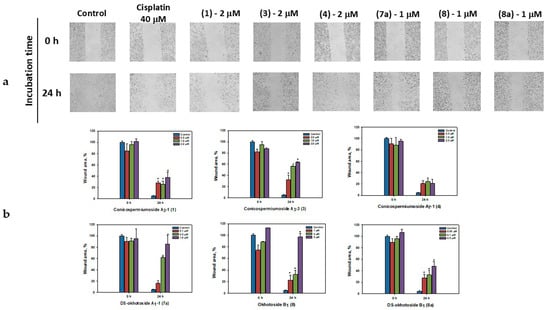 Migration of MDA-MB-231 cells into wound areas observed with an MIB-2-FL fluorescence microscope at 10-fold magnification: (a) MDA-MB-231 cells 0 and 24 h without treatment and after treatment with 2 μM of conicospermiumosides A3-1 (1), A3-3 (3), A7-1 (4), and with 1 μM of DS-okhotoside A1-1 (7a), okhotoside B1 (8), and DS-okhotoside B1 (8a); (b) MDA-MB-231 cells 0 and 24 h after treatment with cisplatin and 0.5–2 μM of the compounds 1, 3, 4, 0.1–1 μM of the glycoside 7a, 0.05–0.5 μM of the compound 8a, and 1–5 μM of the glycoside 8. Cell migration into wound areas processed by ImageJ 1.52 software. Data are presented as means ± SEM. * p value ≤ 0.05 considered significant.