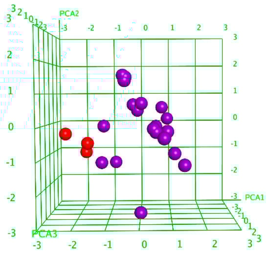 Three-dimensional plot of cytotoxic activity (pIC50) depending on the principal components’ values (PCA1–PCA3) calculated for 25 glycosides. The glycosides that demonstrated cytotoxic activity against non-tumor MCF-10A cell line with ID50 ≤ 10 µM were outlined as active and are marked in red, while the rest are marked in violet.