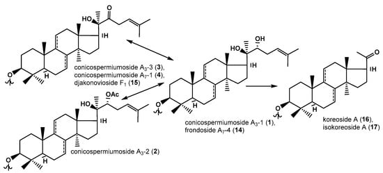 Nine compounds isolated from C. conicospermium were characterized by non-holostane aglycones without lactone, including two hexa-nor-lanostane aglycones in koreoside A (16) and isokoreoside A (17). A comparison of the side chain structures of some lanostane aglycones differing by substituents at C-22 led to the construction of a biogenetic scheme which ended by the formation of hexa-nor-lanostane aglycones (in 16, 17) (Figure 5). A similar set of glycosides was found in C. frondosa [16], but now the blanks are filled with those aglycones having the 22-keto-groups are similar to the direct precursors of vertebrates’ sex steroid hormones without side chains.