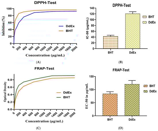 These results suggest that, although the antioxidant potential of the extract increases with increasing concentration, its efficacy remains lower than that of BHT, probably due to the lower reducing power of the active compounds or their lower concentration in the extract. The EC50 (effective concentration to obtain 50% of the maximum effect) is a key measure for evaluating the potency of an antioxidant. In this case, the EC50 of BHT is 84.13 µg/mL, while that of the ethanolic extract of D. dichotoma (DdEx) is 120.53 µg/mL (Figure 2D). This indicates that BHT is more potent than DdEx, requiring a lower concentration to achieve 50% of its maximum antioxidant effect. In contrast, DdEx, with a higher EC50, is less effective, requiring a higher concentration to achieve a similar effect. These results suggest that although DdEx has antioxidant potential, it is less potent than BHT.
