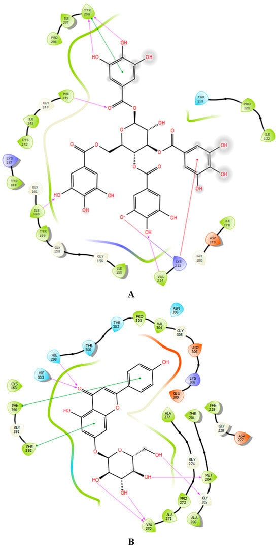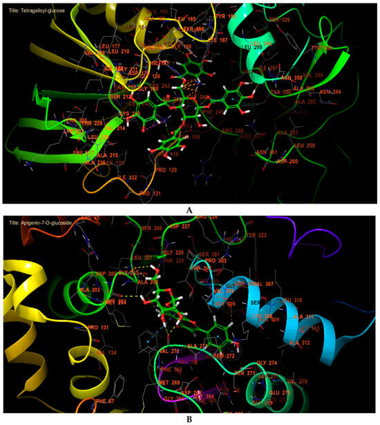 In the active site of NADPH oxidase, tetragalloyl-glucose has established five hydrogen bonds with residues TYR 296, PHE 245, ILE 160, and VAL 214 and one Pi cation bond with residue LYS 213, one Pi-Pi stacking bond with residue TYR 296, and one salt bridge with residue LYS 213 (Figure 3A and Figure 4A). However, apigenin-7-O-glucoside established six hydrogen bonds with residues HIE 298, HIE 333, VAL 270, GLY 205, and MET 204 and two Pi-Pi stacking bonds with residues PHE 390 and PHE 392 in the active site of beta-ketoacyl-[acyl carrier protein] synthase from Escherichia coli (Figure 3B and Figure 4B). In the active site of S. aureus nucleoside diphosphate kinase, pentagalloylglucose established eight hydrogen bond with residues ASP B: 60, ARG B: 111, THR B: 91, LYS B: 9, LYS B: 55, GLY B: 116, and GLU B: 51 and one Pi cation bond with residue LYS B: 9, one Pi-Pi stacking bond with residue HIE B: 52 and one salt bridge with residue MG B: 159 (Figure 3C and Figure 4C). Furthermore, apigenin-7-O-glucoside established five hydrogen bonds with the residues GLY 303, HIS 377, SER 507, MET 508, and TYR 118 in the active site of sterol 14-alpha demethylase (CYP51) from C. albicans (Figure 3D and Figure 4D).