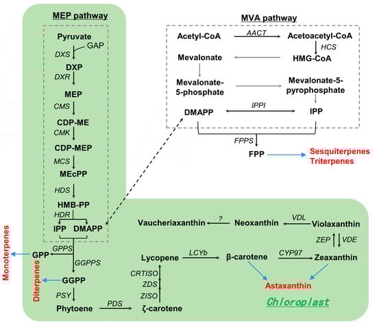 The carotenoid composition of Nannochloropsis can be substantially impacted by nutritional and environmental factors, with N. oceanica being the most well studied. Under high light illumination, N. oceanica shows a reduction in chlorophyll a and most carotenoids (e.g., violaxanthin, vaucheriaxanthin, β-carotene, and neoxanthin), accompanied by an increase in zeaxanthin [,,]. Based on the carotenoid profiles and in silico analysis of carotenogenic genes, carotenoid biosynthetic pathways for N. oceanica have been proposed [], including the production of isopentenyl diphosphate (IPP) and dimethylallyl diphosphate (DMAPP) via the 2-C-methylerythritol 4-phosphate (MEP) pathway, β-carotene biosynthesis from IPP/DMAPP, and β-carotene-derived xanthophyll biosynthesis (Figure 2). Briefly, IPP/DMAPP molecules produced in the MEP pathway are condensed to the 20-carbon geranylgeranyl diphosphate (GGPP) and then to the 40-carbon phytoene through the action of GGPP synthase (GGPPS) and phytoene synthase (PYS), respectively. Phytoene is then desaturated, isomerized, and cyclized to β-carotene, mediated by phytoene desaturase (PDS), ζ-carotene desaturase (ZDS), carotenoid isomerase (CRTISO), and lycopene β-cyclase (LCYB). β-carotene, catalyzed by the heme-containing cytochrome P450 enzymes, is hydroxylated to zeaxanthin, which can be epoxidated to violaxanthin and de-epoxidated back to zeaxanthin, by the enzyme pair zeaxanthin epoxidase (ZEP) and violaxanthin de-epoxidase (VDE). Violaxanthin can be further converted to neoxanthin by a violaxanthin-de-epoxidase-like enzyme (VDL) and then to vaucheriaxanthin via yet-to-be-identified enzymes.