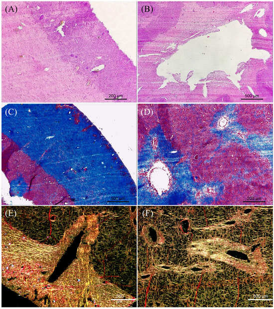 - Lattouf, R.; Younes, R.; Lutomski, D.; Naaman, N.; Godeau, G.; Senni, K.; Changotade, S. Picrosirius Red Staining: A Useful Tool to Appraise Collagen Networks in Normal and Pathological Tissues. J. Histochem. Cytochem. 2014, 62, 751–758. [Google Scholar] [CrossRef]