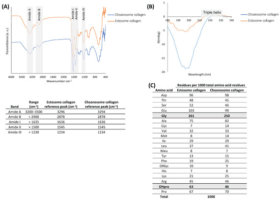 (A) Fourier transform infrared (FTIR) spectra and reference peaks and peak assignments of ectosome (orange line) and choanosome (blue line) collagens. (B) Circular dichroism (CD) spectra of ectosome (orange line) and choanosome (blue line) collagens. (C) Amino acid content of ectosome and choanosome collagens.