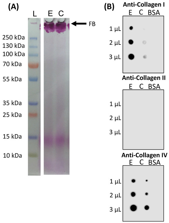 (A) Sodium dodecyl sulfate-polyacrylamide gel electrophoresis (SDS-PAGE) pattern of ectosome and choanosome collagens: L: protein marker; E: ectosome collagen; C: choanosome collagen; FB: fibrillar collagen. (B) Dot blot assay verifying the presence of collagen type I, II, and IV in the ectosome (E) and choanosome (C) collagens; bovine serum albumin (BSA) was used as negative control.