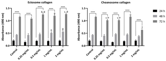 Metabolic activity of untreated L929 cells (control) and treated with ectosome and choanosome collagen dissolved at different concentrations (0.25 mg/mL, 0.5 mg/mL, 1 mg/mL, and 2 mg/mL) for 24 h, 48 h, and 72 h as determined by MTS assay. Data are mean ± standard deviation (n = 3, statistical significance for * p ≤ 0.05; ** p ≤ 0.01 and **** p ≤ 0.0001, and symbols denote statistical differences: α (*) and β (****) compared with 48 h of control, δ (*), ε (**), and γ (****) compared with 72 h of control, θ (****) compared with 72 h of 0.25 mg/mL ectosome collagen, and π (****) compared with 72 h of 2 mg/mL choanosome collagen).