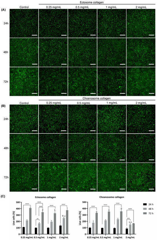 (A) Microscopy of live/dead assay of untreated L929 cells (control) and L929 cells treated with ectosome collagen dissolved at different concentrations (0.25 mg/mL, 0.5 mg/mL, 1 mg/mL, and 2 mg/mL) for 24 h, 48 h, and 72 h. Viable cells were stained with calcein-AM (green), and dead cells with PI (red). Scale bar: 200 μm. (B) Microscopy of live/dead assay of untreated L929 cells (control) and L929 cells treated with choanosome collagen dissolved at different concentrations (0.25 mg/mL, 0.5 mg/mL, 1 mg/mL, and 2 mg/mL) for 24 h, 48 h, and 72 h. Viable cells were stained with calcein-AM (green) and dead cells with PI (red). Scale bar: 200 μm. (C) Quantitative analysis of fluorescence of viable cells (%) treated with ectosome and choanosome collagen at different concentrations (0.25 mg/mL, 0.5 mg/mL, 1 mg/mL, and 2 mg/mL) at 24 h, 48 h, and 72 h. Results are expressed as percentages relative to the control (viable cells of control at 24 h). Data are mean ± standard error (n = 6, statistical significance for * p ≤ 0.05; ** p ≤ 0.01; *** p ≤ 0.001 and **** p ≤ 0.0001, and symbols denote statistical differences: β (*) and ε (**) compared with 72 h of 0.25 mg/mL ectosome collagen, θ (***) and γ (*) compared with 48 h of 0.5 mg/mL and 1 mg/mL ectosome collagen, respectively, α (****) compared with 72 h of 2 mg/mL choanosome collagen and π (***) and λ (****) compared with 48 h of 0.5 mg/mL and 1 mg/mL choanosome collagen, respectively).