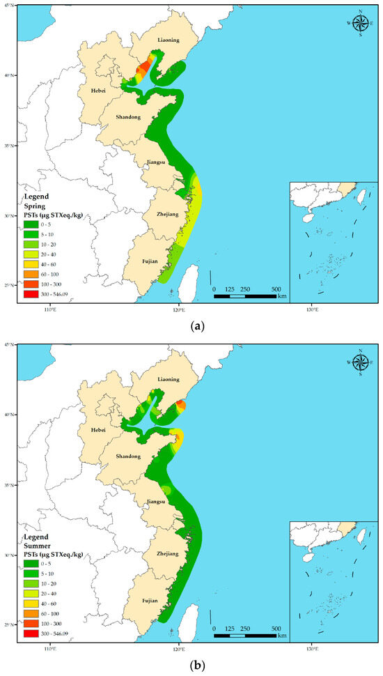 Seasonal variation in PST toxicity in shellfish in different coastal provinces of China. (a) Spring; (b) summer; (c) autumn. Based on the collected sample data, the PST toxicity distribution map across various seasons along the Chinese coast was generated using the spline function interpolation method through ArcGIS 10.8.