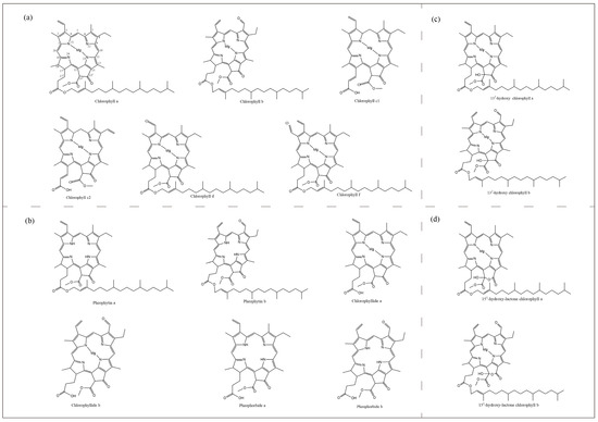 Molecular structure of chlorophylls and their derivatives. (a), Five species of chlorophylls in algae and higher plants. (b), Pheophytin a, Pheophytin b, Chlorophyllide a, Chlorophyllide b, Pheophorbide a, Pheophorbide b. (c), 132-hydroxy chlorophyll a, 132-hydroxy chlorophyll b. (d), 151-hydroxy-lactone chlorophyll a, 151-hydroxy-lactone chlorophyll b.