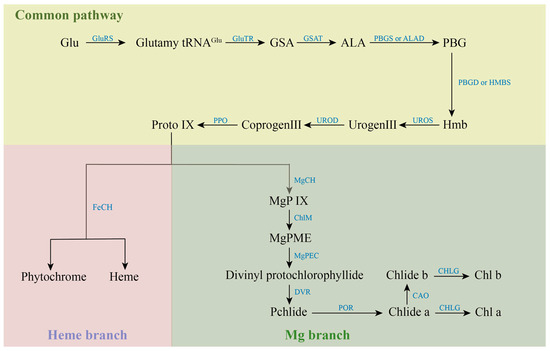 Most of the various mutants are caused by genetic mutations in the process of chlorophyll metabolism, which involves 27 genes and 15 enzymes [15]. The synthesis of chlorophyll is initiated by glutamic acid (Glu), which is catalyzed by Glu-tRNA Synthetase (GluRS). The resulting Glutamyl-tRNAGlu from this reaction is generally considered to be the starting point of chlorophyll synthesis. Catalyzed by Glutamyl-tRNA reductase (GluTR), Glutamy-tRNAGlu is reduced to Glutamate-1-semialdehyde (GSA) and intact tRNA is released. GSA is catalyzed by Glutamate-1-semialdehyde aminotransferase (GSAT) to form δ-aminolevulinic acid (ALA). Subsequently, ALA is catalytically condensed by porphobilinogen synthase (PBGS) or ALA-dehydratase (ALAD) to form monoporphyrin porphobilinogen (PBG). PBG is catalyzed by porphobilinogen deaminase (PBGD) or Hydroxymethylbilane synthase (HMBS) to form a linear hydroxymethylbilane (Hmb). Uroporphyrinogen III synthase (UROS) catalyzes the intramolecular rearrangement of linear Hmb to form uroporphyrinogen III (Urogen III), the common precursor of all natural tetrapyrrole compounds. Under the catalysis of Uroporphyrinogen decarboxylase (UROD), four acetate groups in the side chain of Urogen III were decarboxylated to synthesize coproporphyrinogen III (Coprogen III Coprogen III was decarboxylated and catalyzed by Protoporphyrinogen IX oxidase (PPO) to form protoporphyrin IX (Proto IX). Proto IX is a watershed in the tetrapyrrole biosynthesis pathway, where one is the iron branch, involved in the synthesis of Heme and Phytochrome catalyzed by ferrous chelatase (FeCH). The other is the magnesium branch for the synthesis of Chl, which is catalyzed by the involvement of Magnesium chelatase (MgCh) to give Mg-protoporphyrin IX (MgP IX). The magnesium chelation reaction is a hallmark of the entry of Proto IX into the chlorophyll synthesis pathway, while MgCh is also one of the key enzymes for chlorophyll biosynthesis. MgP IX was methylated to Mg-protoporphyrin IX monomethyl ester (MgPME) catalyzed by S-adenosylmethionone Mg-protoporphyrin IX monomethylester transferase (ChlM). MgPME is cyclized to Divinyl protochlorophyllide catalyzed by Mg-protoporphyrinogen IX monomethylester cyclase (MgPEC). Divinyl protochlorophyllide is catalyzed by 3,8-Divinyl protochlorophyllide an 8-vinyl reductase (DVR), in which the vinyl group at the C-8 position is converted to an ethyl group to produce Protochlorophyllide (Pchlide). Pchlide requires protochlorophyllide oxidoreductase (POR) to catalyze its reduction to chlorophyllide (Chlide) under light conditions. The methyl group at position C-7 of Chlide-a is catalyzed by chlorophyllide a oxygenase (CAO) to form Chlide-b. Finally, Chlide-a or Chlide-b is catalyzed by chlorophyll synthase (CHLG) to form Chl-a or Chl-b. The anabolic process of chlorophylls is shown in Figure 2.
